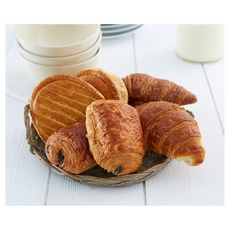 Chausson aux pommes (compote 37% (purée de pommes concentrée 82%, sucre), farine de BLÉ, BEURRE (LAIT) 20%, eau, OEUF, sel), Pain au chocolat au beurre (farine de BLÉ, BEURRE 19,5%, eau, chocolat 10% (sucre, pâte de cacao, beurre de cacao, émulsifiant : E322 (tournesol)), sucre, levure, poudre de LAIT entier, GLUTEN de BLÉ, sel, OEUF, levain de BLÉ d'ÉPEAUTRE séché, farine d'ORGE maltée, extrait de malt d'ORGE, agent de traitement de la farine : E300, enzymes, dorure (OEUF)), Croissant au beurre (farine de BLE, BEURRE 21,5%, eau, sucre, levure, poudre de LAIT entier, GLUTEN de BLE, sel, OEUF, levain de BLE d'EPEAUTRE seche, farine d'ORGE maltee, extrait de malt d'ORGE, agent de traitement de la farine : E300, enzymes, dorure (OEUF)).