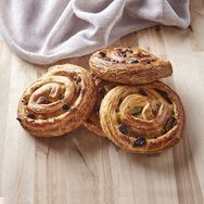 Pate levée feuilletée beurre (farine de BLE, GLUTEN de BLE, eau, BEURRE, sucre, levure, poudre de LAIT, sel), crème pâtissière 20,7% (eau, sucre, LAIT écrémé en poudre, amidon, amidon modifié (maïs), colorant (E160a), arôme, sel, denrée alimentaire colorante (concentré de paprika), OEUF), raisins secs 10,3% (raisins, huile vegetale(huile de graines de coton)), dorure (OEUF).