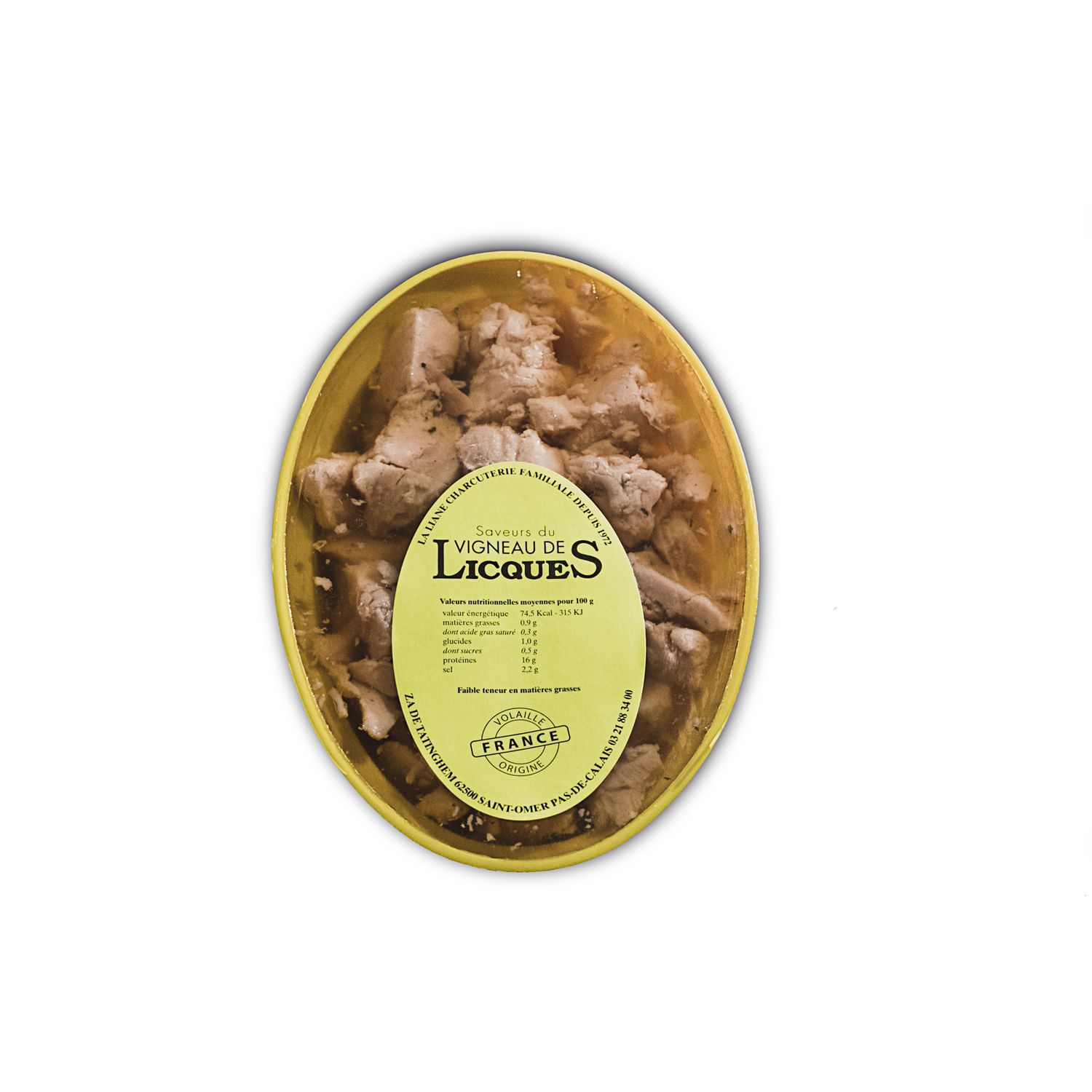 Petit salé de volaille en gelée, préparée et fabriquée par une entreprise familiale depuis 1972.