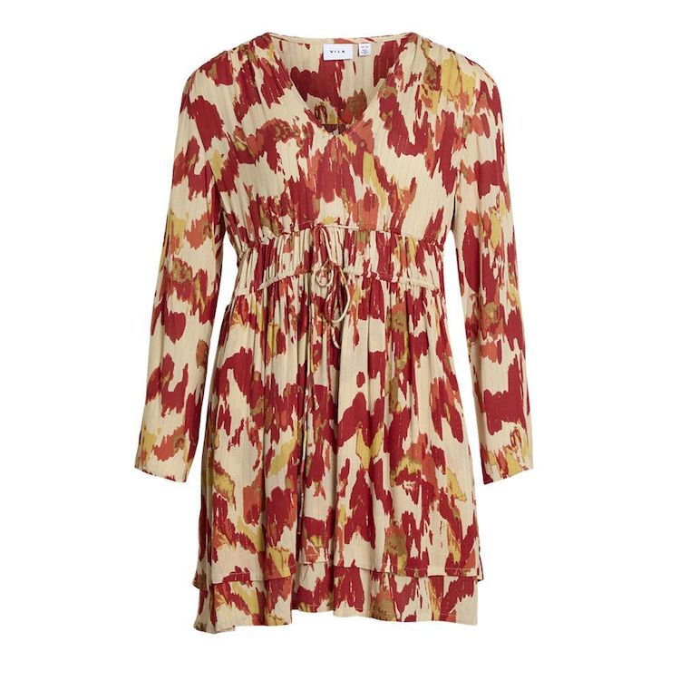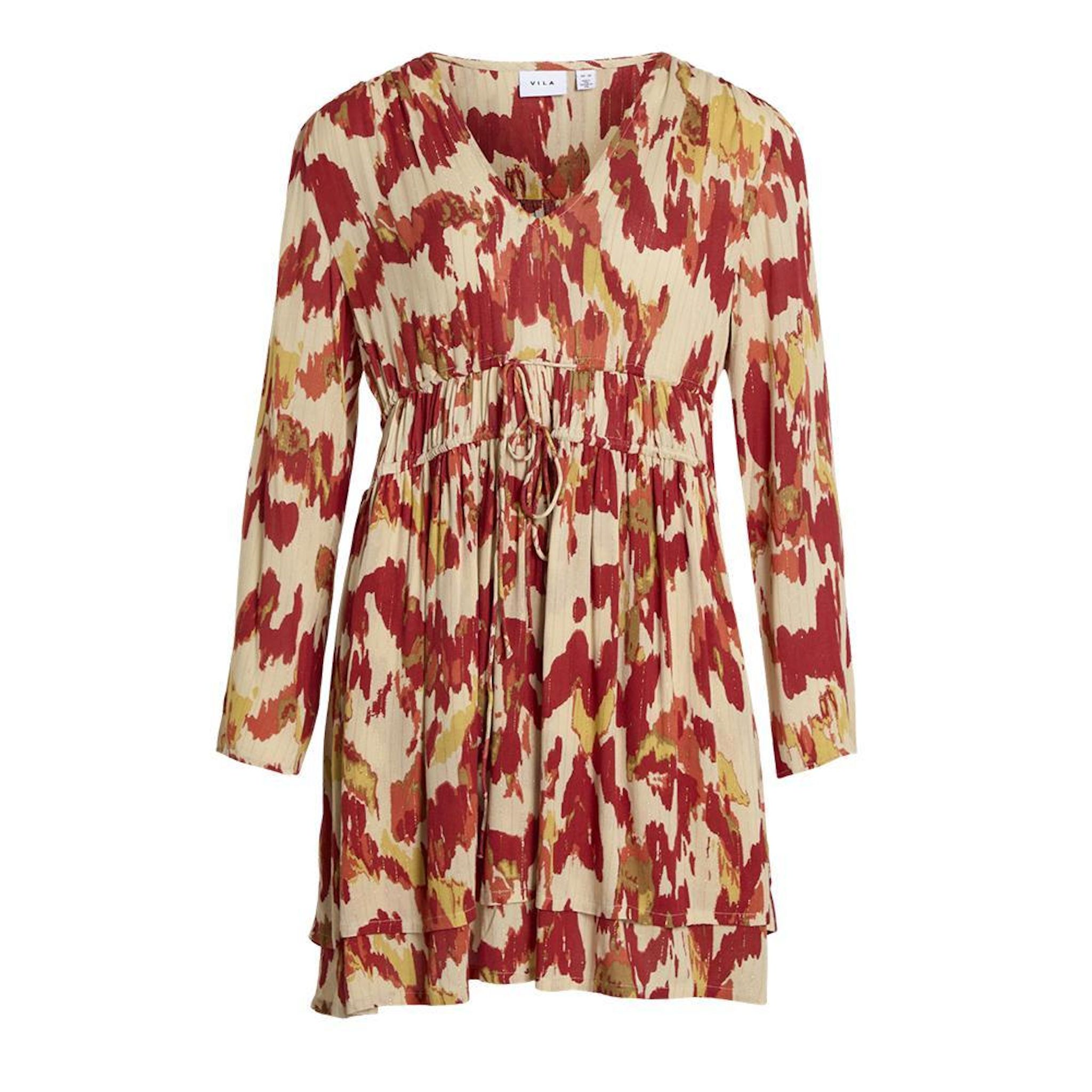 Craquez pour la robe de la marque VILA !Coloris : Beige/Rouge Col VCoupe droiteLongueur courteManches longuesTaille resserréeVolants au basImpriméContient des fils métalisés97% Viscose 3% Fibres métallisées