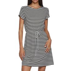 Craquez pour la robe de la marque VILA ! Coloris : Noir/Blanc Rayures Manches courtes Lien à nouer et cordon de serrage à la taille Col rond Tissu stretch doux Composition : 65% Polyester, 35% Viscose
