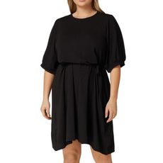 Optez pour cette robe de la marque Vila Evoked !Coloris : noirManches 3/Col rondCeinturé à la tailleComposition : 60% polyester recyclé, 36% polyester, 4% élasthanne