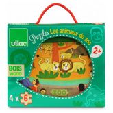 Quatre puzzles en bois de six pièces, sur le thème du zoo, livrés dans un joli coffret en bois illustré.