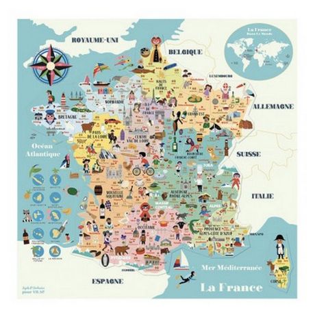 En France, on a de belles montagnes, de beaux fleuves, la mer et l'océan. Mais aussi des grandes et des petites villes, des monuments connus comme la Tour Eiffel et d'autres un peu moins mais tout aussi beaux. On a aussi des iles très loin avec plein de cousins et des iles plus proches petites comme ma poche. On a de belles régions qui ont des nouveaux noms et plein de départements avec des spécialités qui existent depuis longtemps ! On a aussi la meilleure gastronomie au monde, des vins et champagnes plein nos campagnes ! C'est avec talent et poésie qu'Ingela P. Arrhenius a dessiné cette très belle carte magnétique en bois pour apprendre la géographie en s'amusant.. Contenu : 92 magnets en bois et 1 grand fond magnétique illustré. 50 x 44 x 1 cm