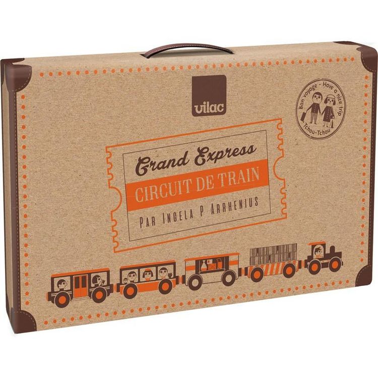 En voiture voyageurs, montez à bord du train Grand Express d Ingela P. Arrhenius. Un joli circuit de train de 40 pièces en bois composé de : 1 locomotive, 4 wagons, circuit 24 pièces, 1 gare, 2 maisons, 2 personnages, 4 arbres et 2 panneaux de signal