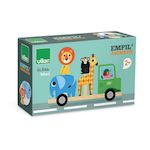 Découvrez ce jeu d'éveil en bois dessiné avec malice par Ingela P.Arrhenius. Votre enfant va craquer pour les figurines animaux de la savane, le camion vert, et les multiples associations possibles sur la grande remorque. C'est parti pour un safari plein de surprises. Les 4 figurines en bois peuvent