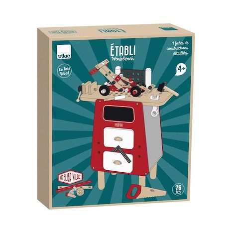 Bienvenue dans l atelier Vilac ! Cet établi original en bois avec son look vintage permettra aux enfants de faire comme les grands. Une scie pour découper des planches sans se faire mal, c est possible grâce à la planchette magique qui se sépare avec