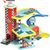 Un grand garage bleu avec ascenseur, porte déployante, rouleaux de lavomatic, barrière de parking, rampes en plastique et tremplin et ses accessoires en bois (2 voitures, un hélicoptère et panneaux de signalisation). Ce garage fait partie de la collection Vilacity et est compatible avec le petit circuit, le grand circuit et la station d'essence vilacity.
