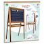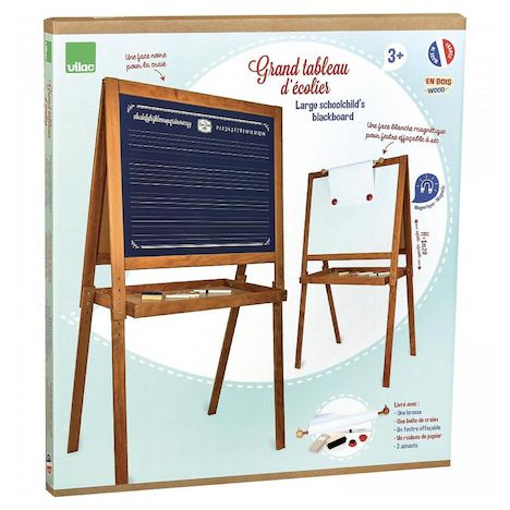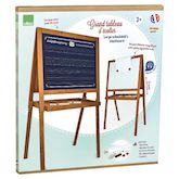 Un grand tableau en bois sur pied avec une face pour écrire à la craie sur les lignes et une autre face blanche magnétique pour feutres et aimants. Ce tableau est doté également d'un rouleau de papier pour dessiner. Livré avec rouleau de papier, magnets, brosse à tableau, craies et feutres.