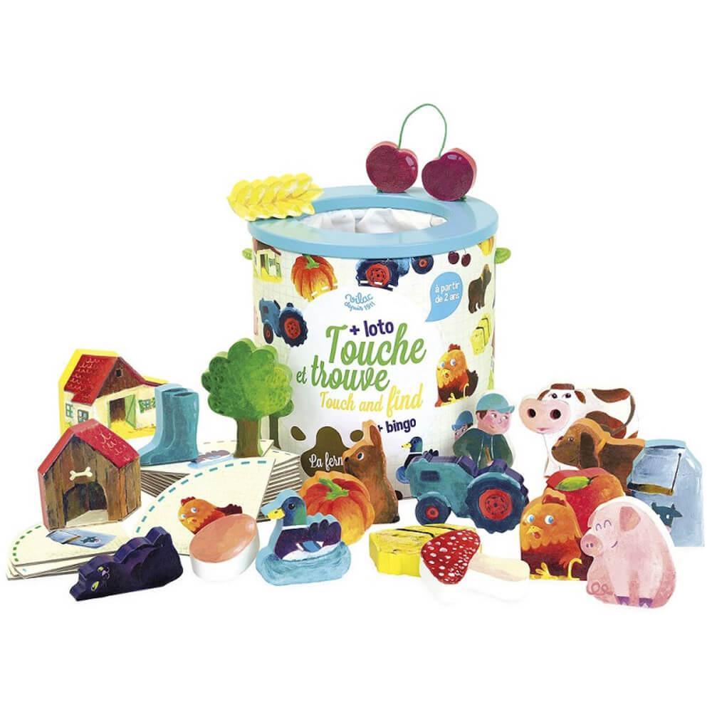 L' incontournable jeu Touche et Trouve décliné en une version ferme. Le touche et trouve est un jeu de reconnaissance tactile qui consiste à mettre la main dans le sac pour retrouver des pièces sans regarder ! Composé d'un barile de rangement, de 21 pièces en bois dont une pièce piège, de 20 cartes illustrées autour du thème de la ferme. Avec ces cartes illustrées, le touche et trouve se transforme également en jeu de loto. A partir de 2 ans. Age minimum : 24 mois - Fabricant : VILAC SA - BP 10 MOIRANS EN MONTAGNE CEDEX 39260 France - https://www.vilac.com/