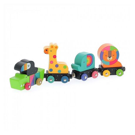 Un jouet d'éveil en bois original. Favorise l'acquisition de la motricité fine. Jouet d'éveil Montessori. Animaux interchangeables. Wagons aimantés.