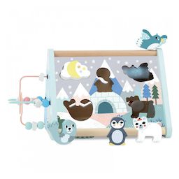 Posé comme une tente ou à la verticale, chaque face regorge de surprises pour développer la motricité des enfants à partir de 1 an. Que de choses à découvrir : des engrenages à actionner, des petites têtes à pivoter, un hibou et un renard à faire voyager, un cylindre de neige à faire tourner et des