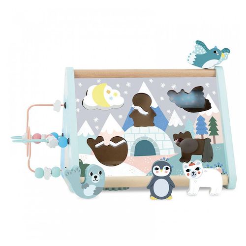 Posé comme une tente ou à la verticale, chaque face regorge de surprises pour développer la motricité des enfants à partir de 1 an. Que de choses à découvrir : des engrenages à actionner, des petites têtes à pivoter, un hibou et un renard à faire voyager, un cylindre de neige à faire tourner et des perles et nuages à déplacer sur un fil ! Dans l'igloo de l'ours, une petite porte latérale avec des charnière élastiques permet à l'enfant de récupérer les pièces qu'il aura encastrées sur un des côtés. Avec de nombreuses activités variées, ce triangle d'éveil en bois est un incontournables dans l'univers des petits. ? Un triangle d'éveil. ? 5 figurines à encastrer. ? Une porte pour accéder à l'intérieur. ? Un hibou et un renard à déplacer sur un chemin. ? Un cylindre sonore pour simuler le bruit de neige. ? Des engrenages à tourner. ? 3 jetons à faire tourner. ? 2 parcours fil sur lesquels déplacer des perles et nuages.