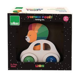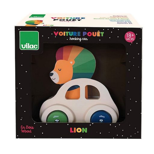 Montez à bord de cette voiture toute ronde, illustrée par Andy Westface. Craquez pour ce jouet d'éveil qui va accompagner votre enfant dans le développement de son imagination et de sa motricité fine. Au volant de ce bolide, un adorable lion et sa crinière colorée. Et surprise ! Lorsque votre enfant appuie sur la tête du lion, elle émet un pouet pouet amusant. Points forts :. ? Jouet en bois, durable. ? Développement de la motricité fine. ? Découverte, observation, réflexion. ? Enrichissement du vocabulaire. ? Jouet d'éveil Montessori. ? Premier jouet d'éveil incontournable. ? Univers coloré. ? Stimulation de l'imagination. ? Surprise sonore en appuyant sur la tête du lion.