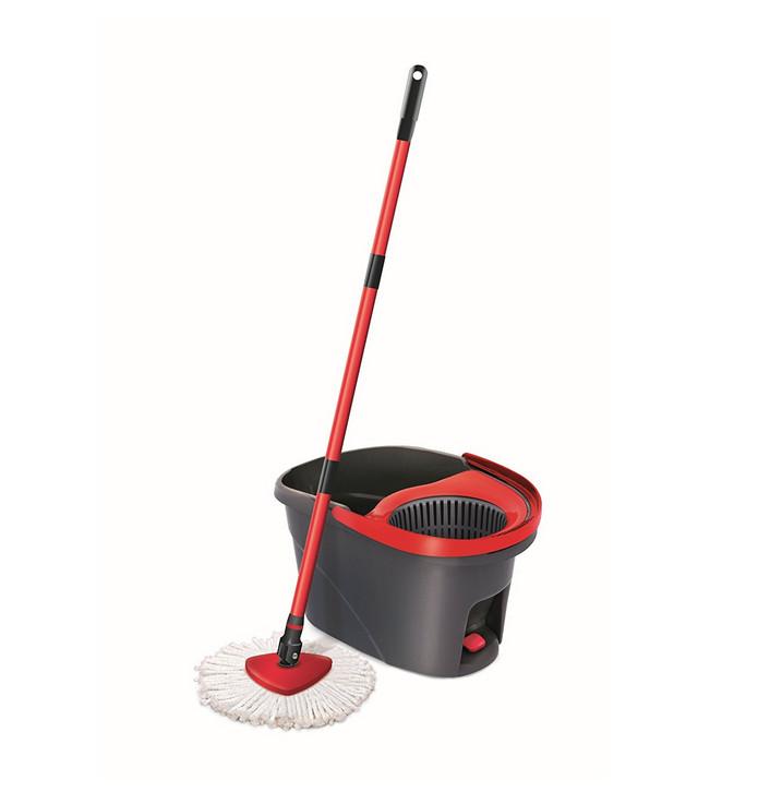 Vileda 2321000 Le kit Easy Wring & Clean 2321000 de Vileda contient un seau à pédale pour essorer facilement, franges 100% microfibres absorbantes et dégraissantes, un balai à tête triangulaire pour un nettoyage dans les coins, manche télescopique : de 85 à 130 cm pour un nettoyage facile sans se courber et sans se mouiller les mains.