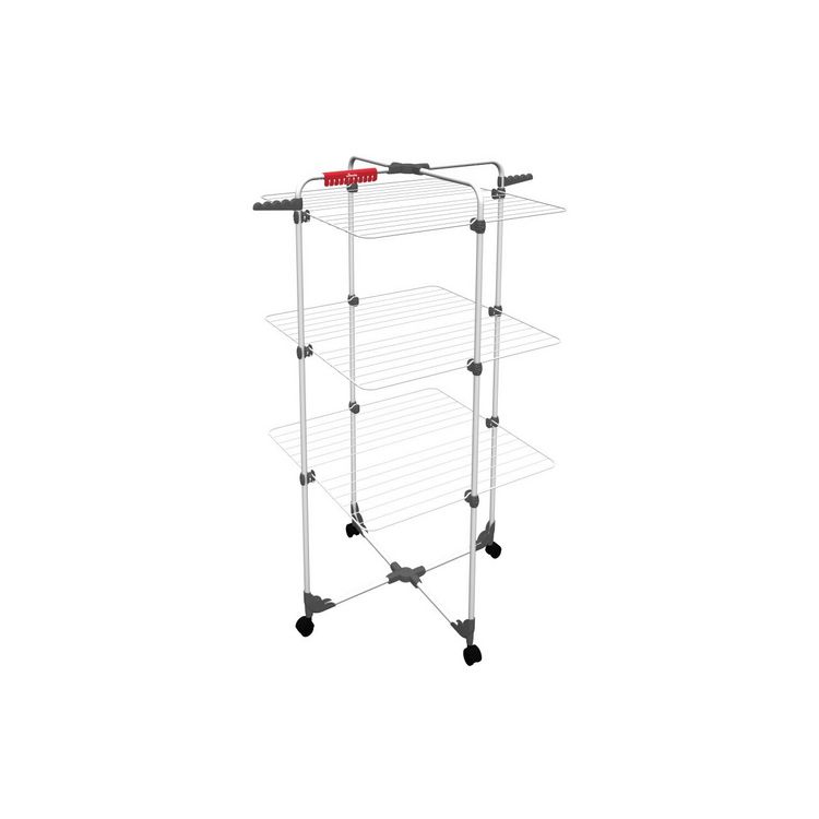 Vileda 157244 Séchoir à linge tour Mixer 3 Vileda 157244 très modulable et multi-usages. Séchoir modulable à 3 étages en acier avec une capacité de séchage jusqu'à 3 machines. Grâce à ses plateaux indépendants, il peut être utilisé complètement ouvert - afin de sécher de longues pièces de linge et les pièces délicates à plat - ou bien à demi replié contre un mur ou un radiateur si vous avez une petite quantité de linge ou que vous avez besoin de gagner de la place. Un espace de séchage supplémentaire est disponible grâce au support pour petites pièces (comme les chaussettes ou les sous-vêtements) et aux 2 portes-cintres. Les roues pivotantes vous permettent de le déplacer facilement. Lorsque vous ne l'utilisez pas, vous pouvez le le replier à plat pour le ranger.Une capacité totale de séchage de 30m avec très peu d'encombrement au sol. Utilisable aussi dans la douche.Modulable grâce à son joint spécial : vous pouvez l'utiliser à moitié replié ou complètement ouvert. 6 plateaux indépendants parfait pour sécher les longues pièces de linge ou pour un séchage à plat des pièces plus délicates.