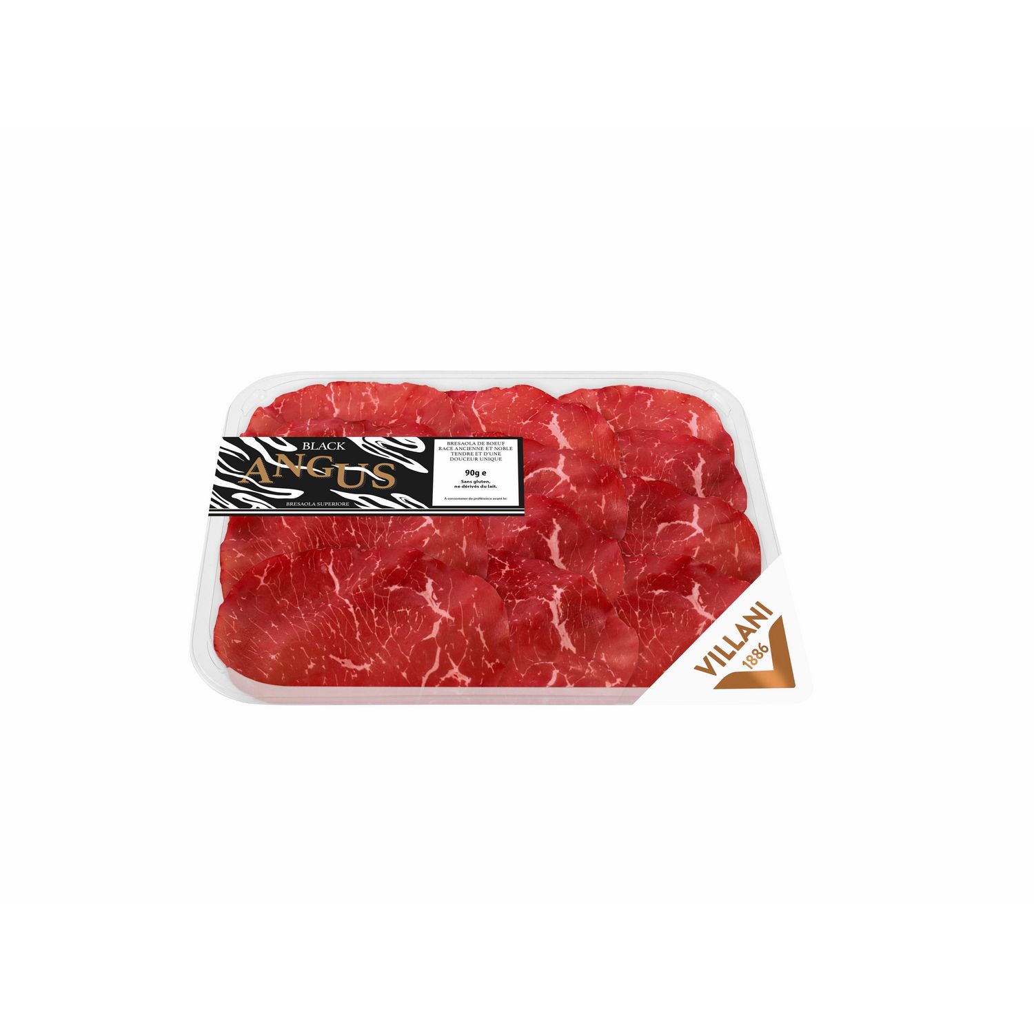 Produite à partir de viande de bœuf, de race Black Angus, une viande d’une qualité supérieure reconnue. On utilise exclusivement la partie interne de la meilleure qualité et la plus tendre. Elle se distingue par son goût délicat au persillage caractéristique. Très riche en protéines, elle fait partie de la charcuterie qui répond le mieux aux besoins nutritionnels modernes. Une bresaola pour les connaisseurs et les fins palais.