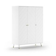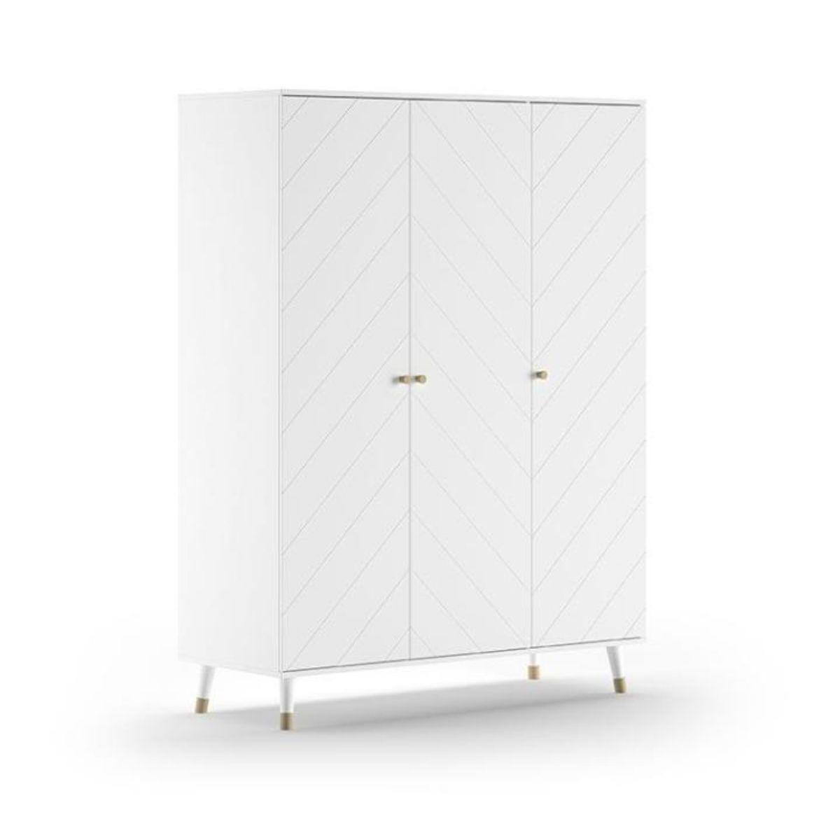 L'armoire BILLY à 3 portes est fabriqée en MDF de haute qualité en blanc. Le motif graphique associé aux pieds dorés lui confère un caractère rétro moderne. Cette armoire offre un espace de rangement généreux pour organiser et ranger vos affaires de manière soignée. Le côté gauche de l'armoire est é