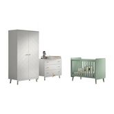 Cette combinaison Billy se compose d'un lit bébé vert, d'une commode blanche avec une table à langer blanche et d'une armoire à deux portes.