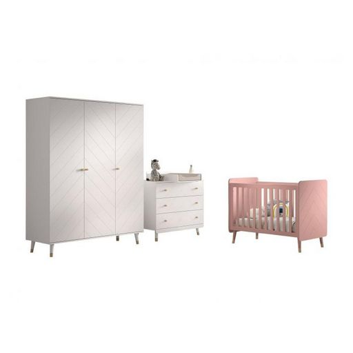 Cette combinaison Billy se compose d'un lit bébé rose, d'une commode blanche avec une table à langer blanche, et d'une armoire à trois portes.