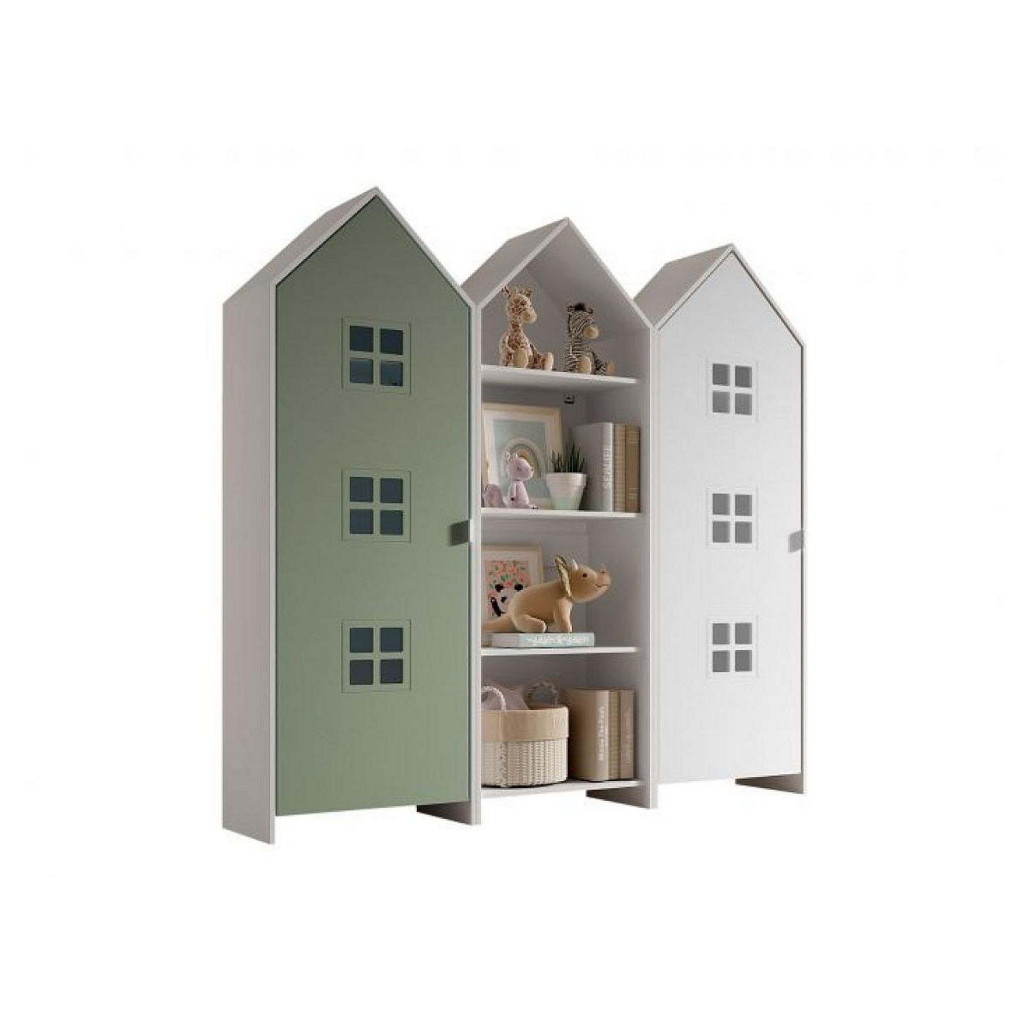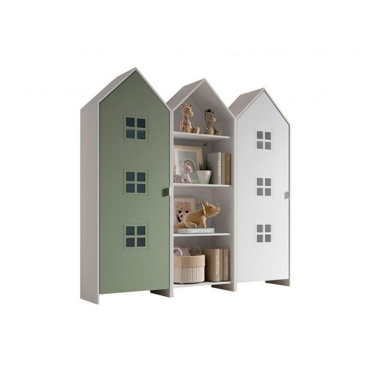 Cette combinaison se compose de 3 armoires : 1 armoire ouverte CASAMI, 1 armoire CASAMI BRUGES avec une porte en Entangled Green et 1 armoire avec une porte blanche. Les armoires de la collection CASAMI, en forme de cabanes de plage, apportent immédiatement une touche ludique et colorée à n'importe quelle chambre d'enfant et offrent également l'espace de rangement nécessaire pour les vêtements, les jouets et de nombreux autres objets.