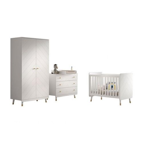 Cette chambre de bébé BILLY en 4 pièces se compose du lit de bébé BILLY avec commode avec plan à langer et armoire à 2 portes. Le motif graphique associé aux pieds dorés lui confère un caractère rétro-moderne. Ces articles sont fabriqués en MDF blanc de haute qualité laqué. Le sommier à lattes est i
