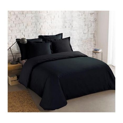 Parure de couette unie : 1 housse de couette 200 x 200 cm et 2 taies d'oreiller 65 x 65 cm a volant plat - 100% coton tissé serré 57 fils - Noir - Certification : oeKOTEX - Teinture réactive qui garantit une excellente tenue des couleurs - Fermeture boutons-pression - Lavable en machine a 40°C.
