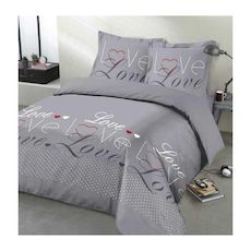 La parure LOVE gris contient une housse de couette de 240cm de large et de 220cm de long avec 2 taies assorties de 65x65cm. La housse de couette se ferme avec des boutons pressions ce qui permet de bien garder la couette en position. Les taies sont finies avec un volant plat pour un rendu chic. Le tissu est en 100% coton, fibres naturelles, donnant un toucher tres doux. Les coloris sont gris, blanc et rouge.