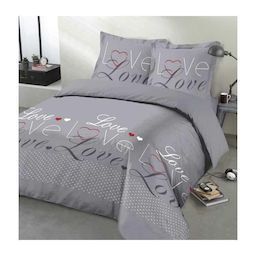 La parure LOVE gris contient une housse de couette de 240cm de large et de 220cm de long avec 2 taies assorties de 65x65cm. La housse de couette se ferme avec des boutons pressions ce qui permet de bien garder la couette en position. Les taies sont finies avec un volant plat pour un rendu chic. Le t