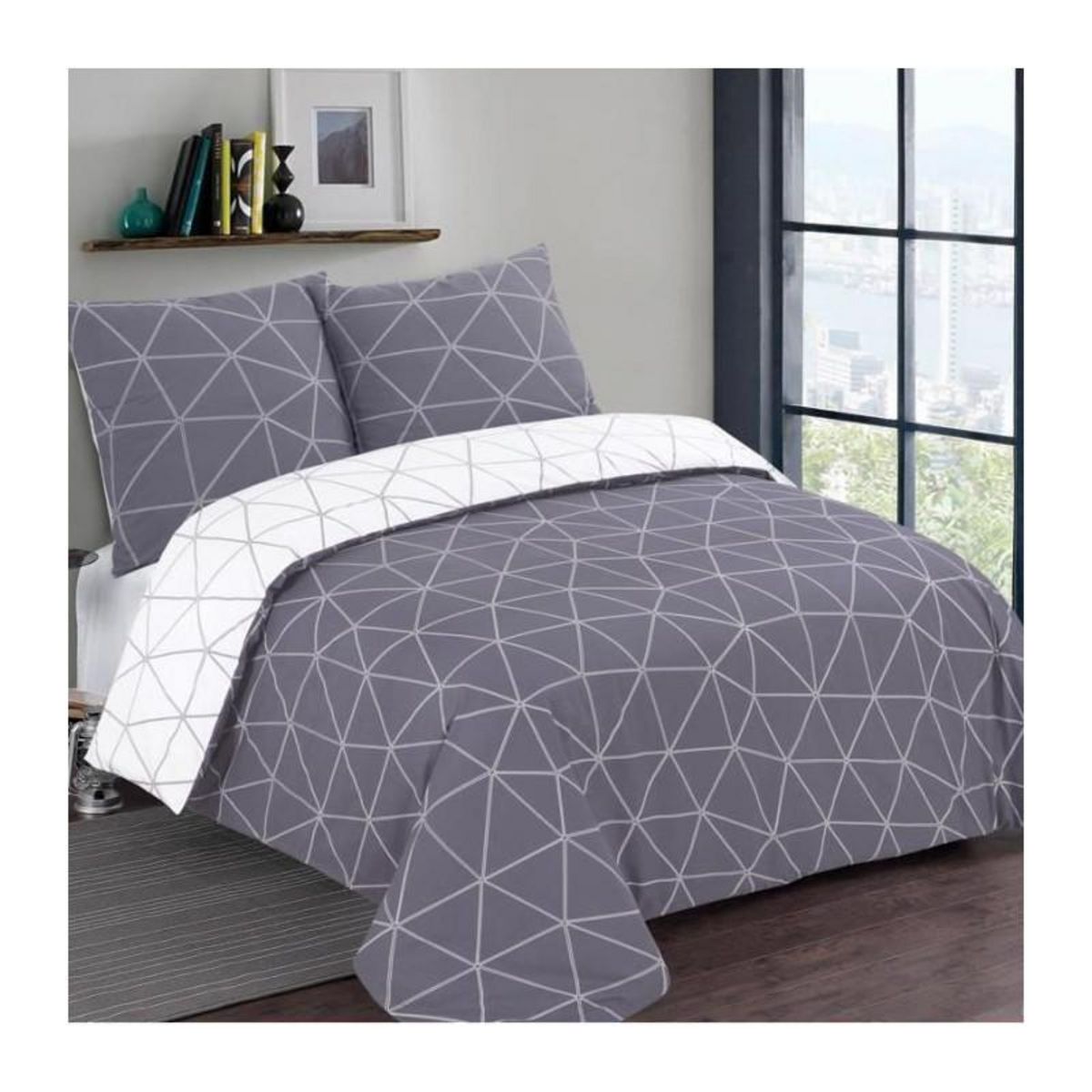 VISION - Parure de lit HUGO gris réversible - 100%Coton - 1 housse de couette 200x200cm + 2 taies 65x65cm - Gris-blanc