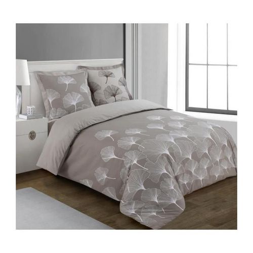 VISION - Parure de lit réversible GINKO - 100%Coton - 1 housse de couette 200x200cm + 2 taies d'oreiller 65x65cm - Beige