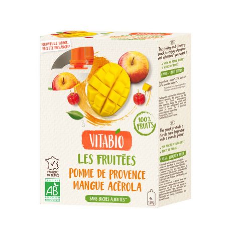 Pour profiter pleinement de l’intérêt nutritionnel des fruits tout en se faisant plaisir, Vitabio a élaboré une gamme d’encas gourmands sans sucres ajoutés* à emporter partout et à savourer à tout moment de la journée., Toute la douceur de la pomme de Provence alliée à la gourmandise de la mangue et au pep's de l'acérola dans un encas sans sucres ajoutés*, à emporter partout et à savourer à tout moment de la journée.