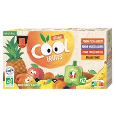 COOL Fruits Pomme Pêche Abricot : Pomme de France* 69,9%, pêche* 20%, abricot* 10%, jus de citron* 0,1%.