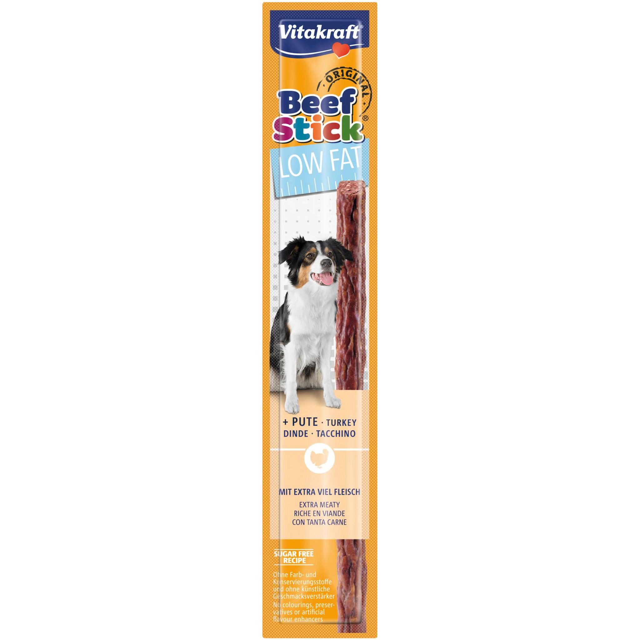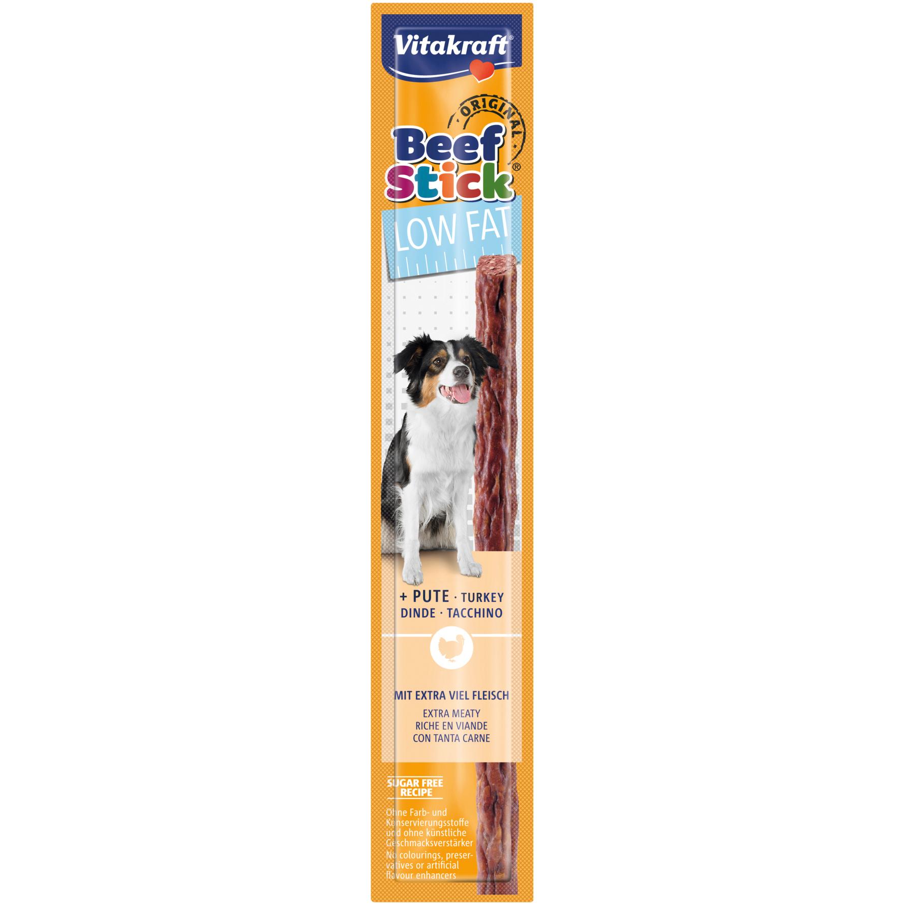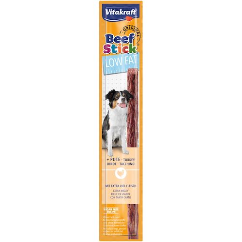 Le Beef Stick Low Fat est le snack parfait pour gâter les chiens qui ont des problèmes de surpoids car 40 % des chiens français sont y sont sujets. Il contient 20% de graisse en moins que le Beef Stick au boeuf et est en plus enrichi en L-carnitine qui stimule la combustion des graisses. Recette sans sucres ajoutés."