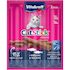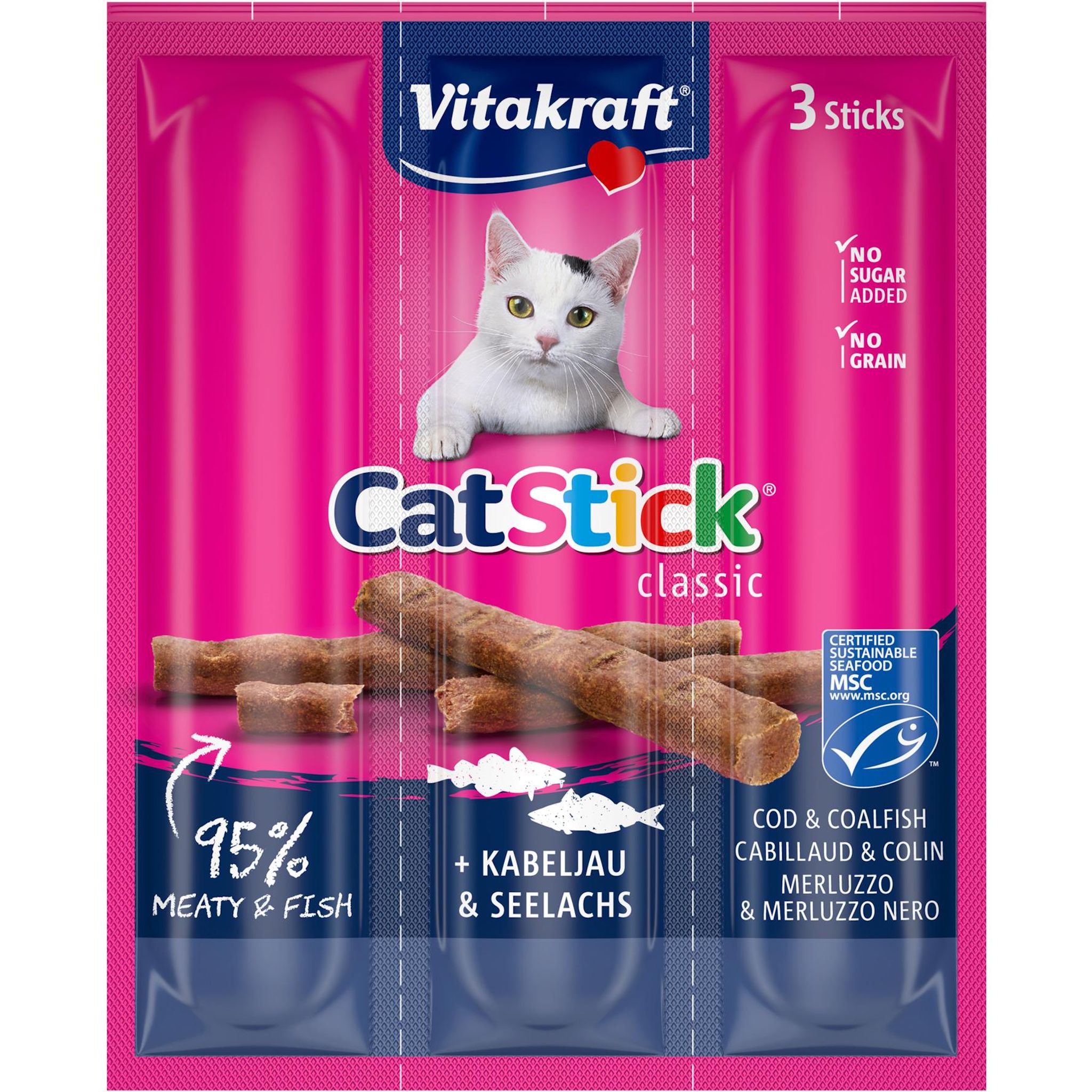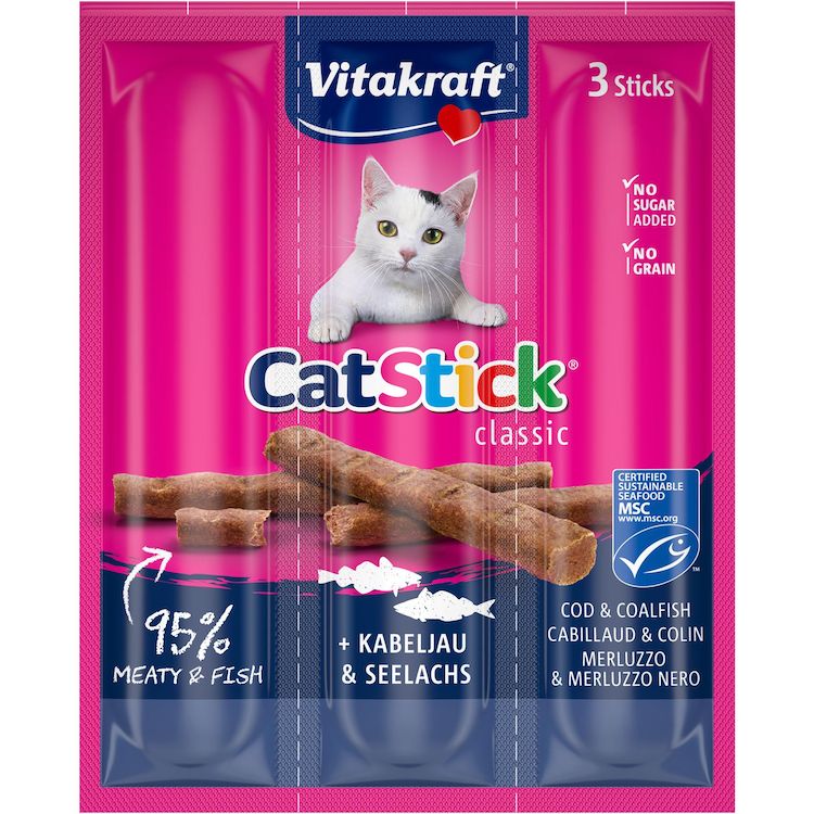 La friandise, au colin et au cabillaud, préférée des chats même les plus difficiles : un goût inimitable pour un taux d’acceptation jusqu’à 98 %. Une teneur en poissons de 80 %. Une odeur volontairement neutre car l’odorat du chat est délicat. Recette sans sucres ajoutés, sans colorants et sans arômes artificiels.