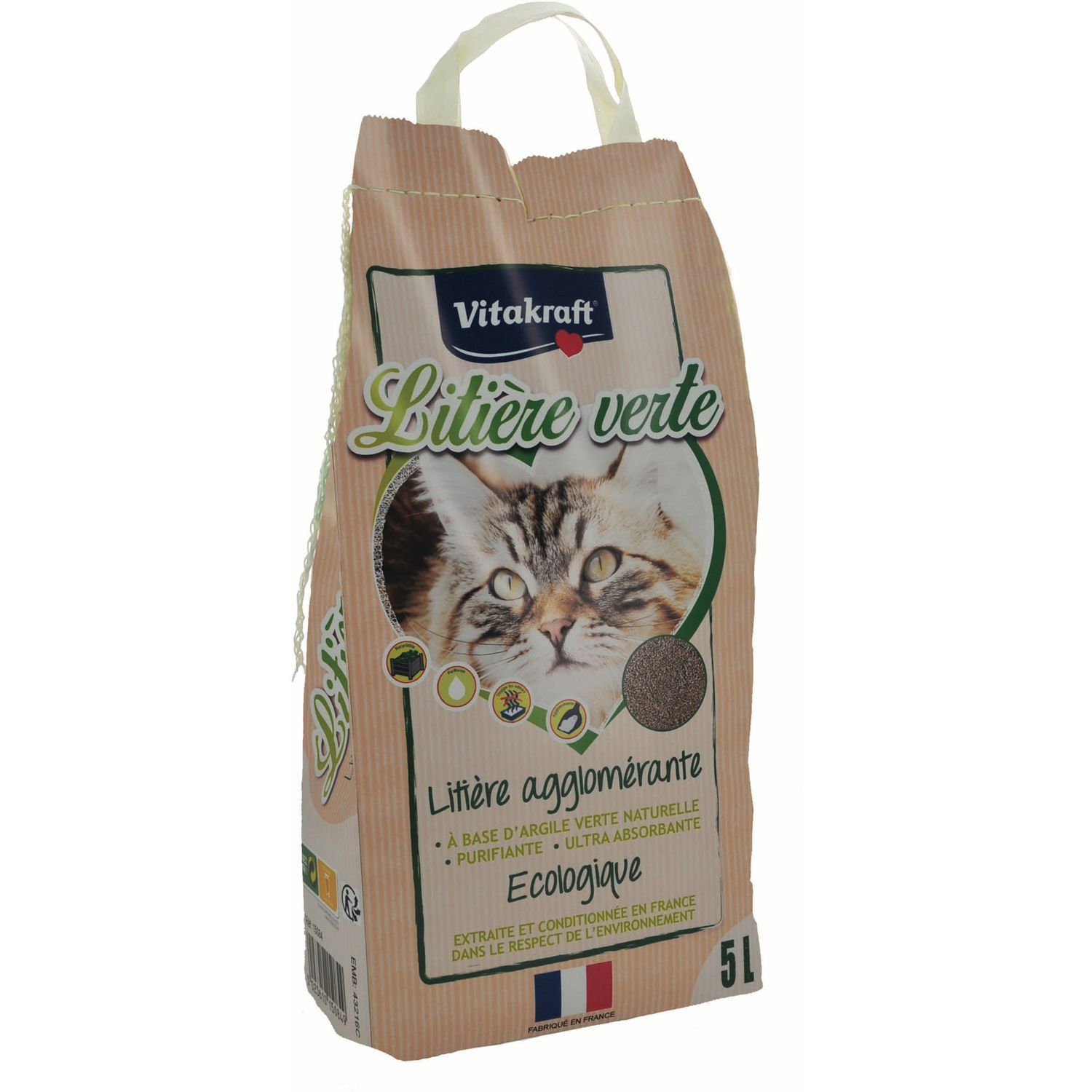 Litière minérale agglomérante à base d’argile verte 100 % naturelle reconnue purifiante et désinfectante et ultra absorbante. Ecologique : extraite et conditionnée en France dans le respect de l’environnement et facilement recyclable en compost. Litière verte 5L