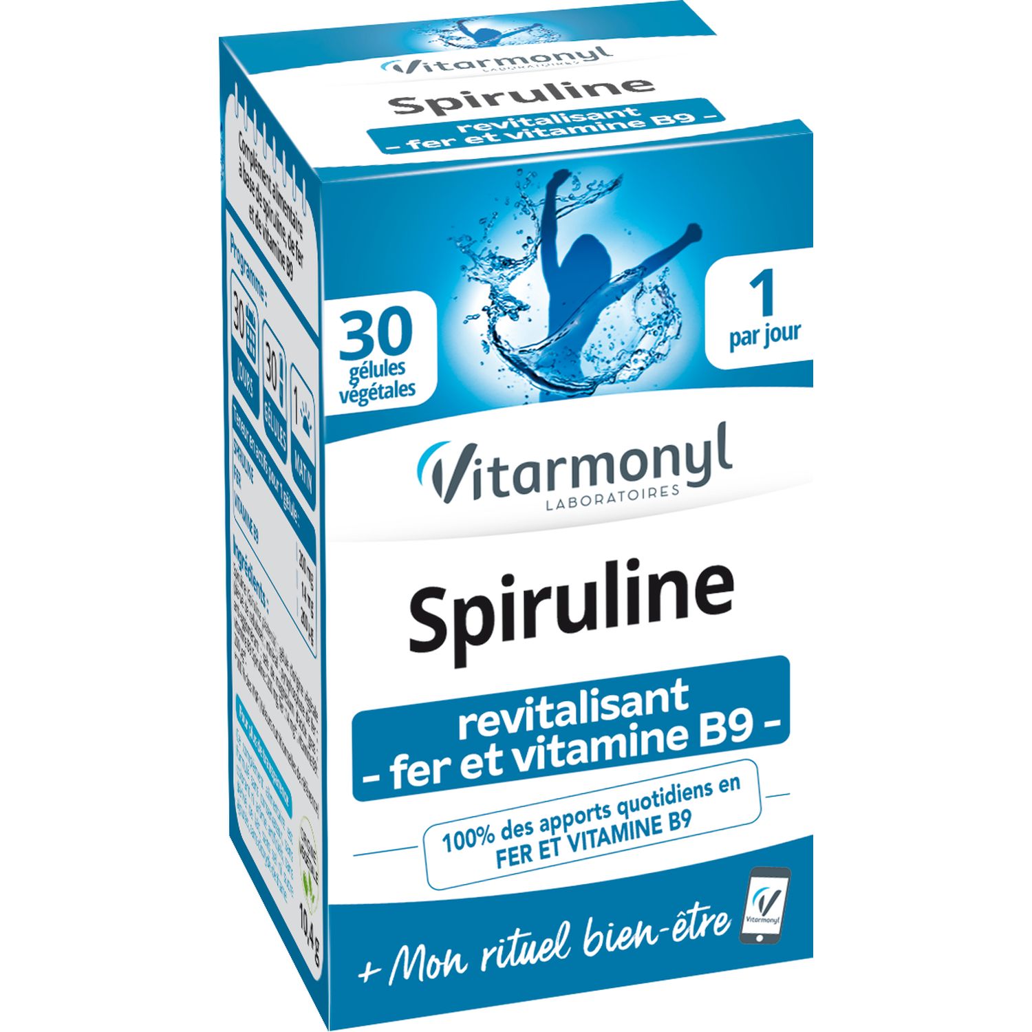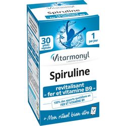 Spiruline - Fer - Vitamine B9 - 30 gélules La spiruline est une micro-algue qui se développe dans les lacs d'eau douce et qui existe depuis plus de 3 milliards d'années. Elle doit son nom à sa forme en spirales.  Le fer et la vitamine B9 aident à retrouver tonus et vitalité et soutenir les défenses naturelles.  La spiruline est considérée comme un "super nutriment" du fait de son extraordinaire richesse en minéraux, oligo-éléments et vitamines dans un si petit volume. Le fer et la vitamine B9 contribuent au fonctionnement normal du système immunitaire et aident à réduire la fatigue afin de retrouver tonus et vitalité.