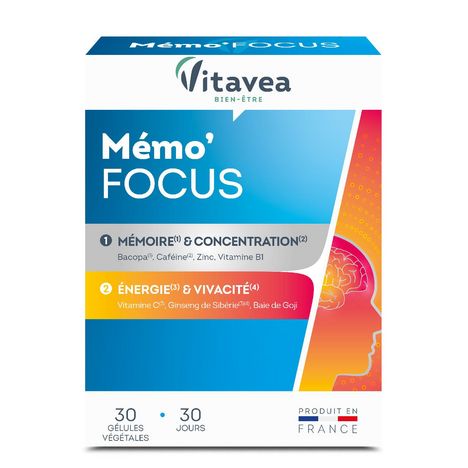 La formule Mémo'Focus VITAVEA Bien-être est votre alliée pour une double action concentration et vitalité.