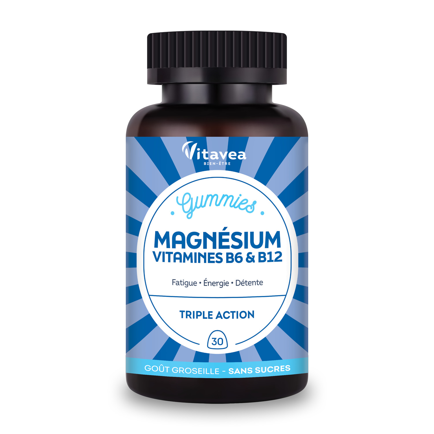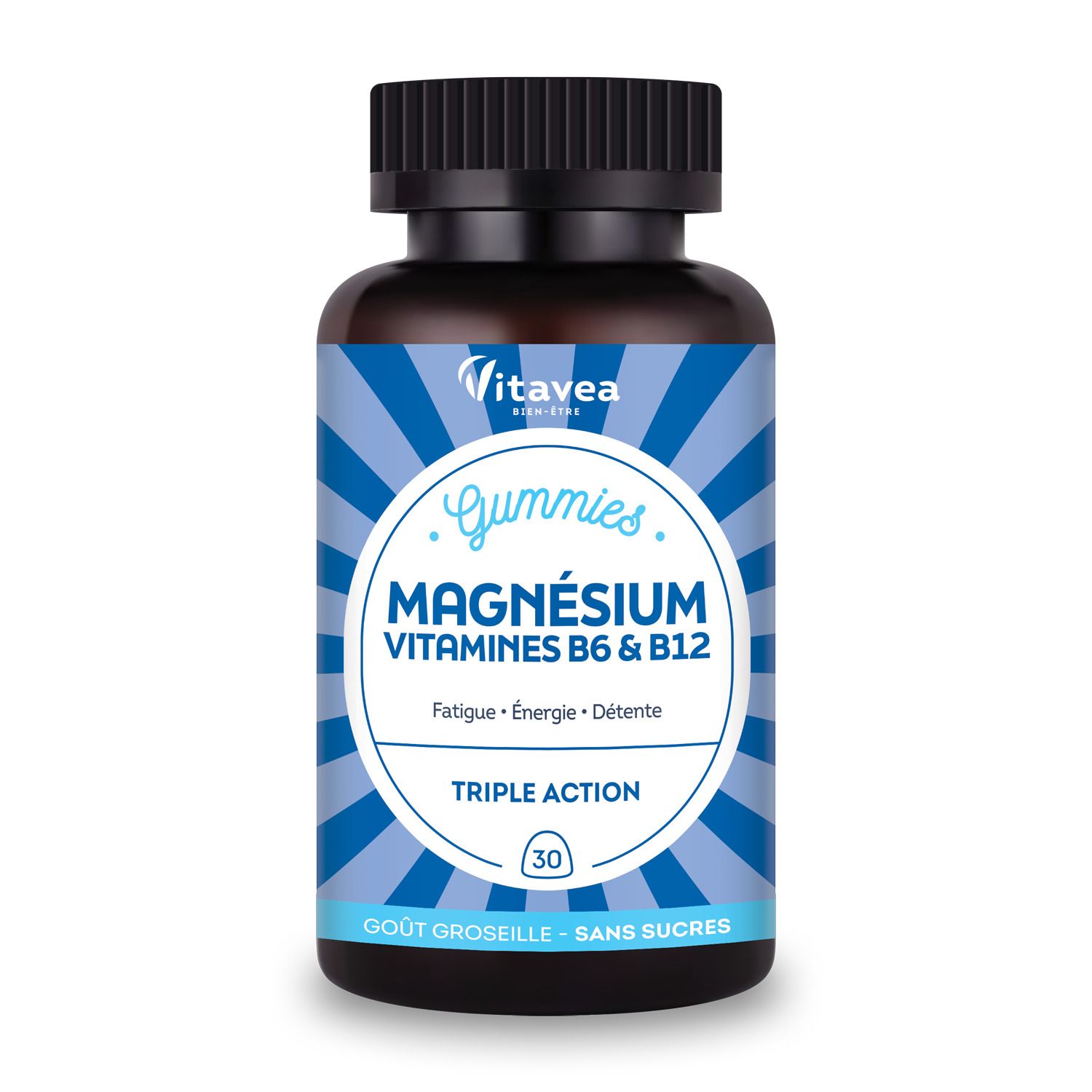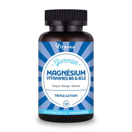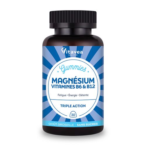 Gummies Magnésium VITAVEA Bien-être est un complément alimentaire. Sa formule alliant magnésium, vitamine B6 et vitamine B12 aide à réduire la fatigue, à contribuer au bon fonctionnement du système nerveux et à favoriser la détente et la relaxation. Des gummies au bon goût de cassis sans sucres pour faire le plein d'énergie.