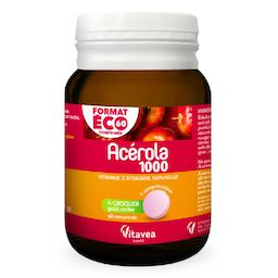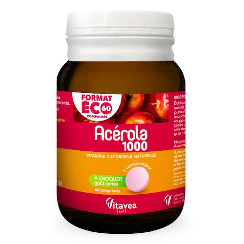 Au maintien du bon fonctionnement du système immunitaire L'acérola 1000 Mg Vitavea est formulé à partir d'extrait sec d'acérola de vitamine C d'origine naturelle.