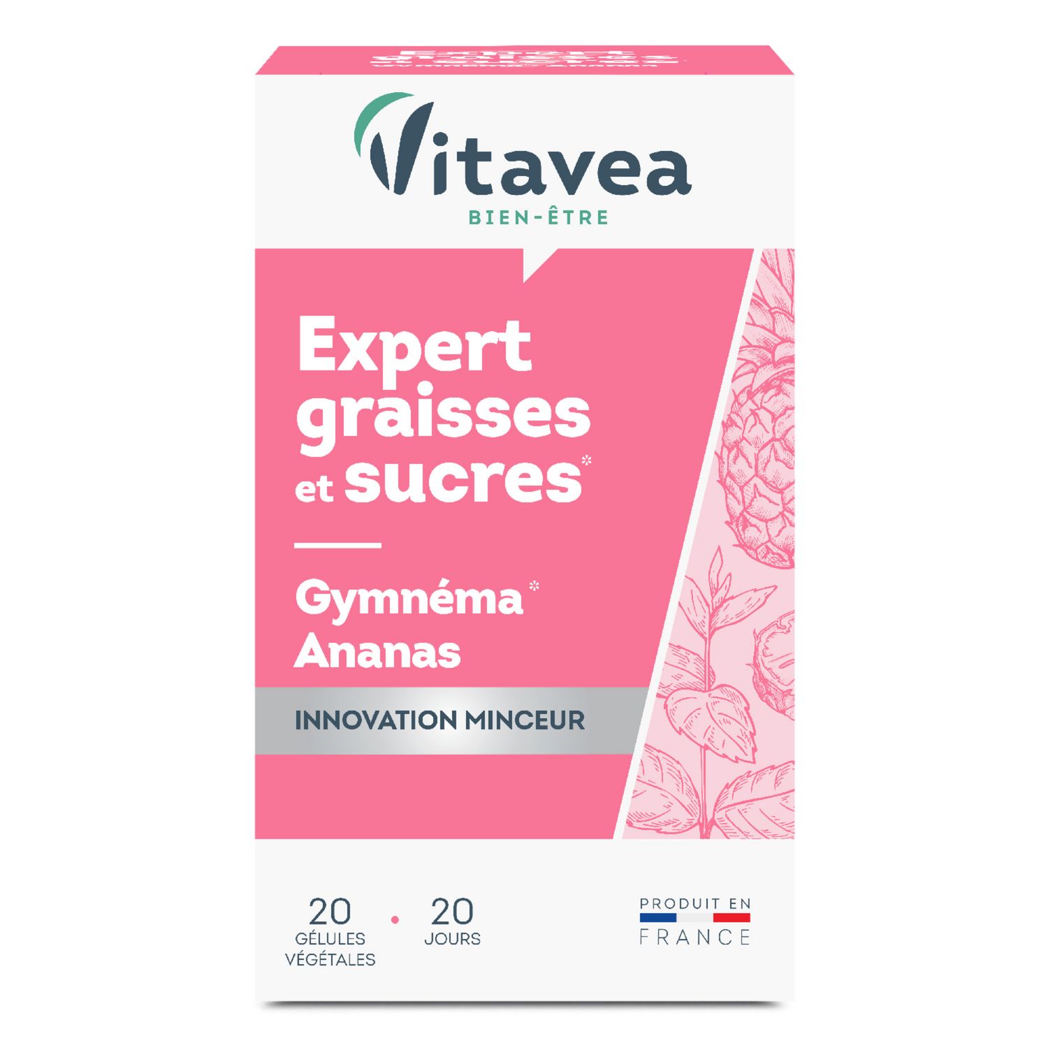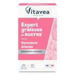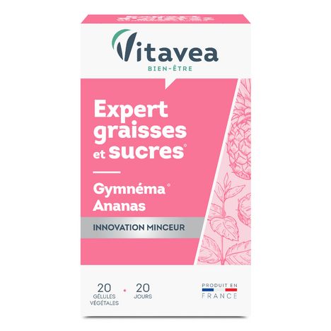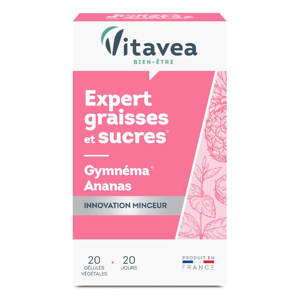 Expert graisses et sucres VITAVEA Bien-être est un complément alimentaire qui contient des actifs reconnus et plébiscités pour limiter la prise de poids, limiter l'absorption des graisses et des sucres pour favoriser le contrôle du poids : gymnéma et ananas.