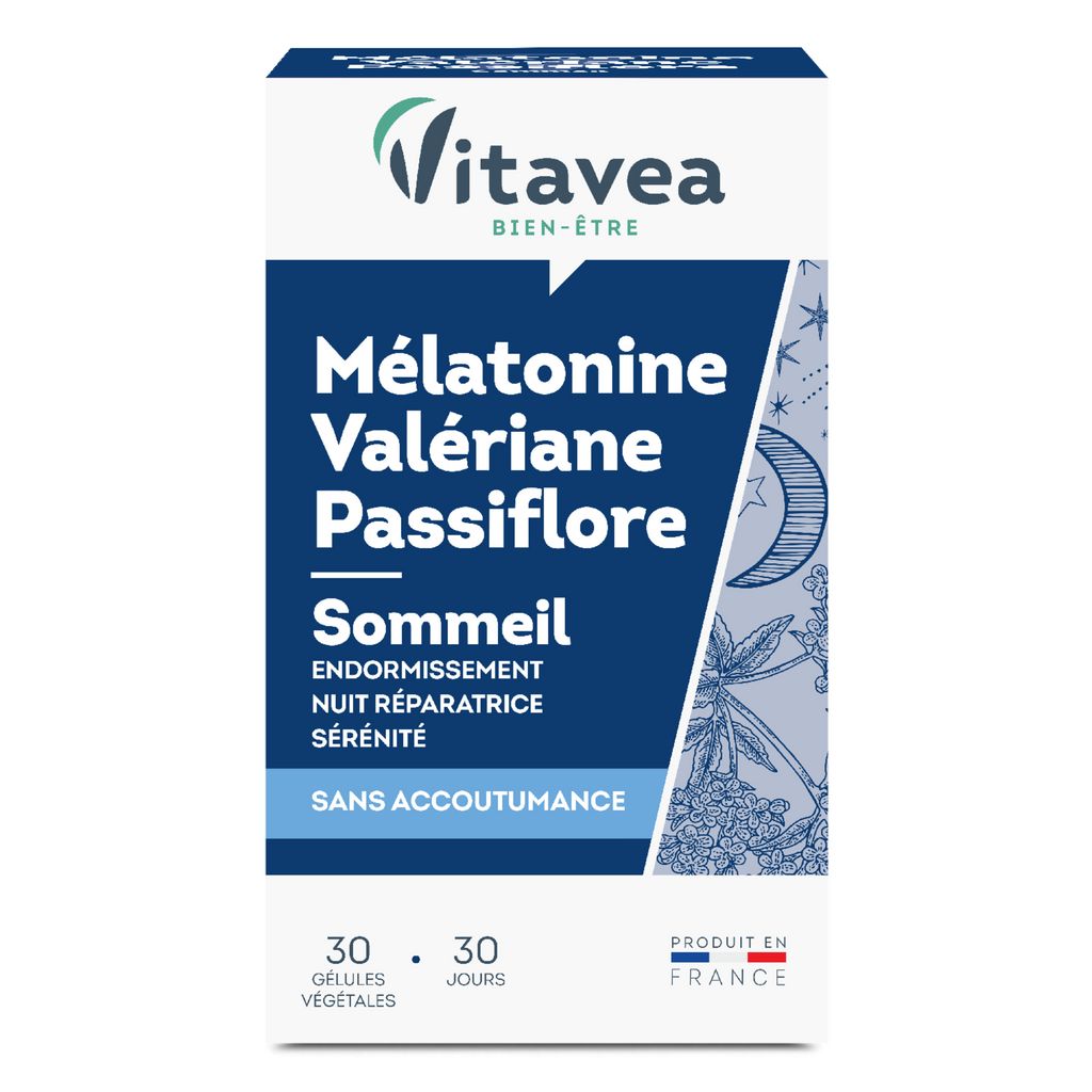 Mélatonine Valériane Passiflore VITAVEA Bien-être est un complément alimentaire qui contient des actifs reconnus et plébiscités pour contribuer à réduire le temps d'endormissement et la relaxation et pour favoriser un sommeil de qualité.
