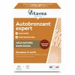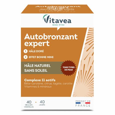 L'Autobronzant Expert VITAVEA Bien-être est un complément alimentaire, sa formule complète associe 11 actifs reconnus et plébiscités pour sublimer la peau, obtenir un teint doré et uniforme, procurer un effet bonne mine naturel et participer à la formation normale du collagène : sélénium, béta-carotène, zinc, vitamines E, B5 et C, cuivre, citrus, rose d'inde, lutéine, carotte