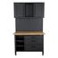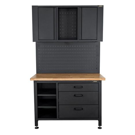 - Rangement optimisé : 3 tiroirs, niche latérale avec 3 étagères réglables, panneau porte outil mural, meuble haut à portes