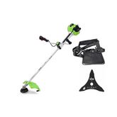 Livrée avec une bobine de fil avec tête automatique déroulante, une lame 3 dents, des clés, un doseur de mélange et un gilet harnais de portage. Le gilet fourni vous libère du poids de la débroussailleuse et vous permet de travailler sans contrainte.