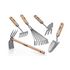 Composition du KIT jardin VITO : une serfouette 3 dents + panne avec manche bois, une pelle transplantoir de jardin, un râteau 5 dents, un petit balai à gazon, une serfouette.