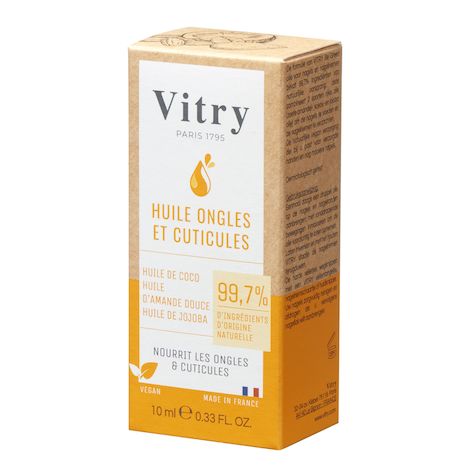 L'huile ongles et cuticules Vitry Be Green est formulée avec 99,7 % d'ingrédients d'origine naturelle : elle allie 3 huiles précieuses (huile d'amande douce, huile de coco et huile de jojoba) pour nourrir les ongles tout en assouplissant les cuticules. Le soin naturel et vegan qui vous accompagne pour des mains soignées et des ongles encore plus beaux !