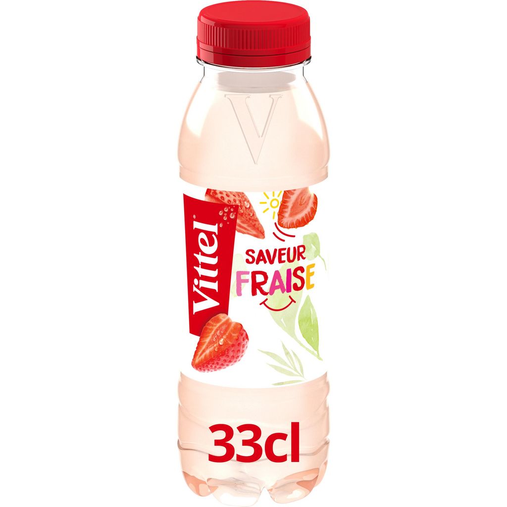 Boisson à l'eau minérale naturelle VITTEL, aromatisée à la fraise.