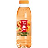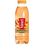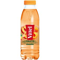 eau minérale naturelle Vittel (84.4%), jus de fruits à base de concentrés 10% (pêche 5%, abricot 5%), sucre liquide, arôme naturel de pêche, arôme naturel d'abricot avec autres arômes naturels, arôme naturel, acidifiant: acide citrique, concentrés (citron, carthame, carotte).