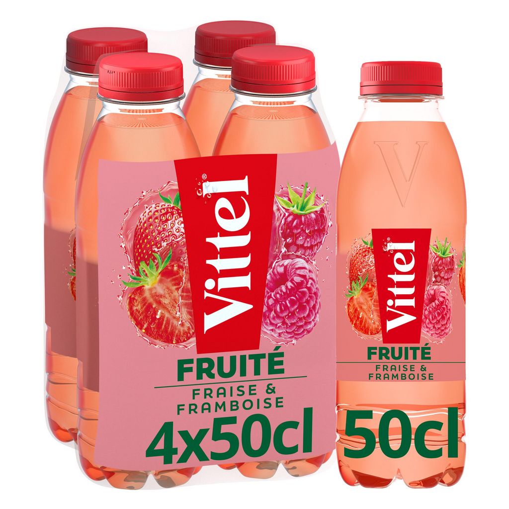 Ingrédients : Eau minérale naturelle Vittel (86%), jus de fruits à base de concentrés 8% (fraise 4%, framboise 4%), sucre liquide, arôme naturel de fraise, arôme naturel de framboise avec autres arômes naturels, arôme naturel, acidifiant : acide citrique, concentrés (carotte, citron).
